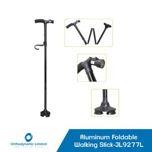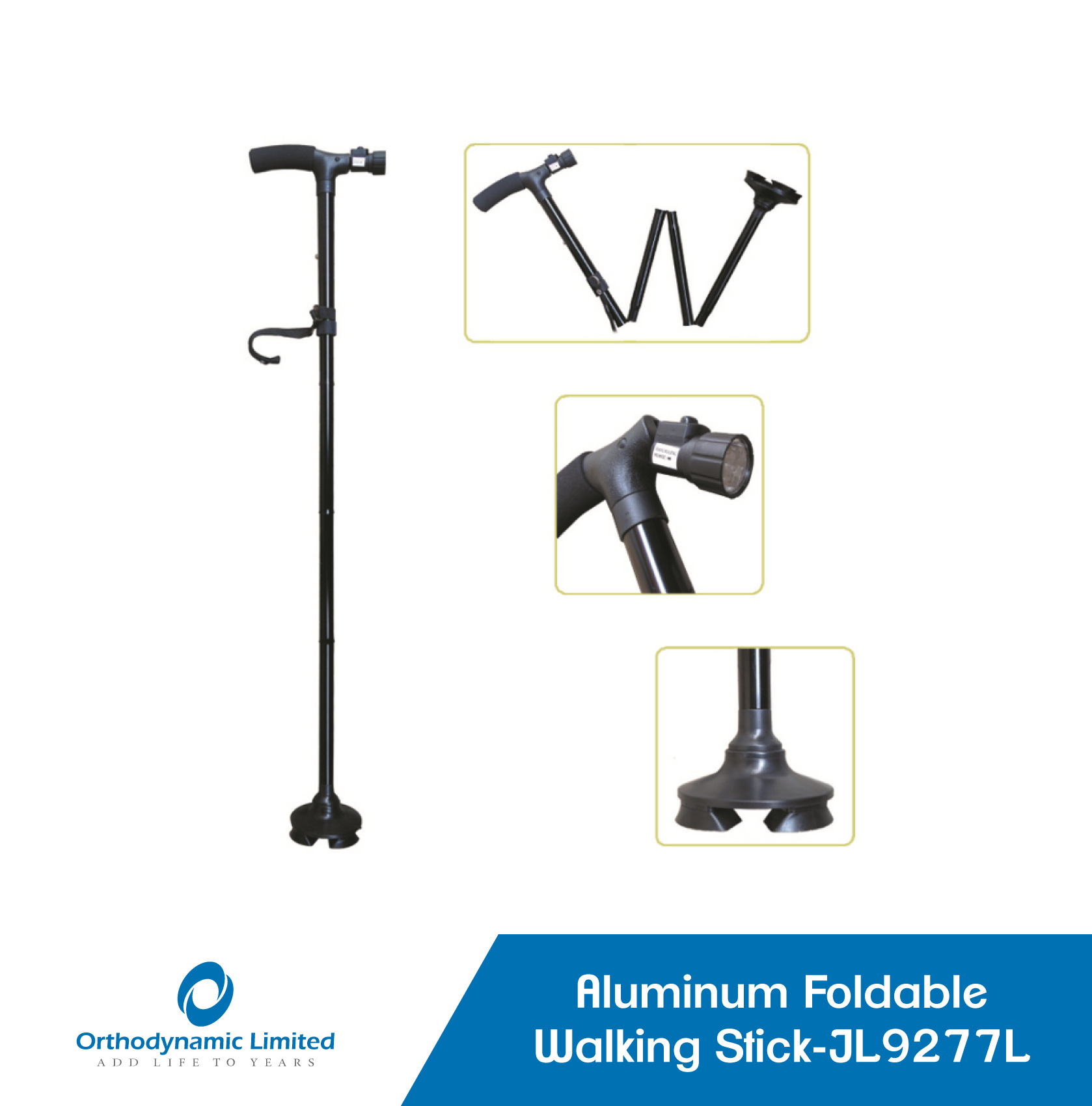 Foldable Walking Stick is an innovative, lightweight folding cane for individual mobility. This cane can be folded up without a tool while not in use and comes with a LED flashlight for illuminating and rescue warning. The upper tube has a spring lock pin for adjusting handle height to fit different users.